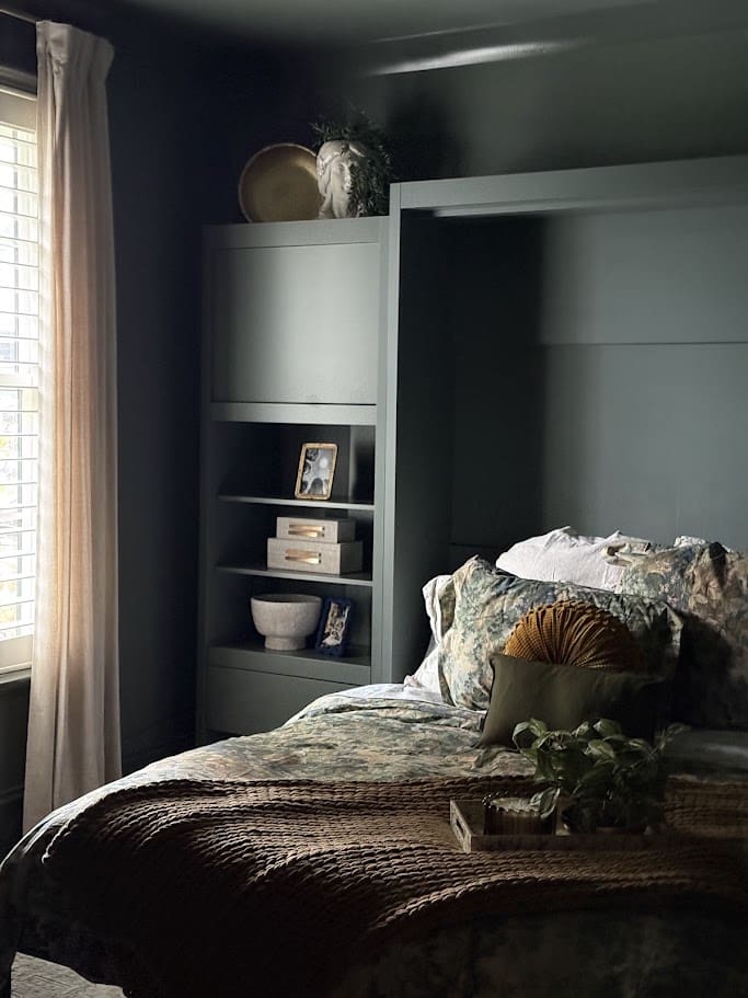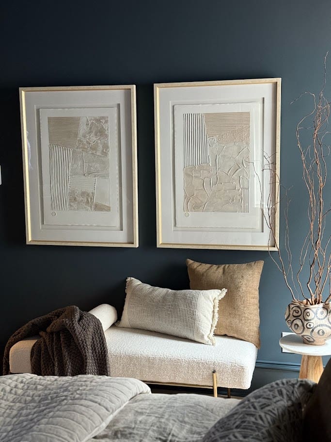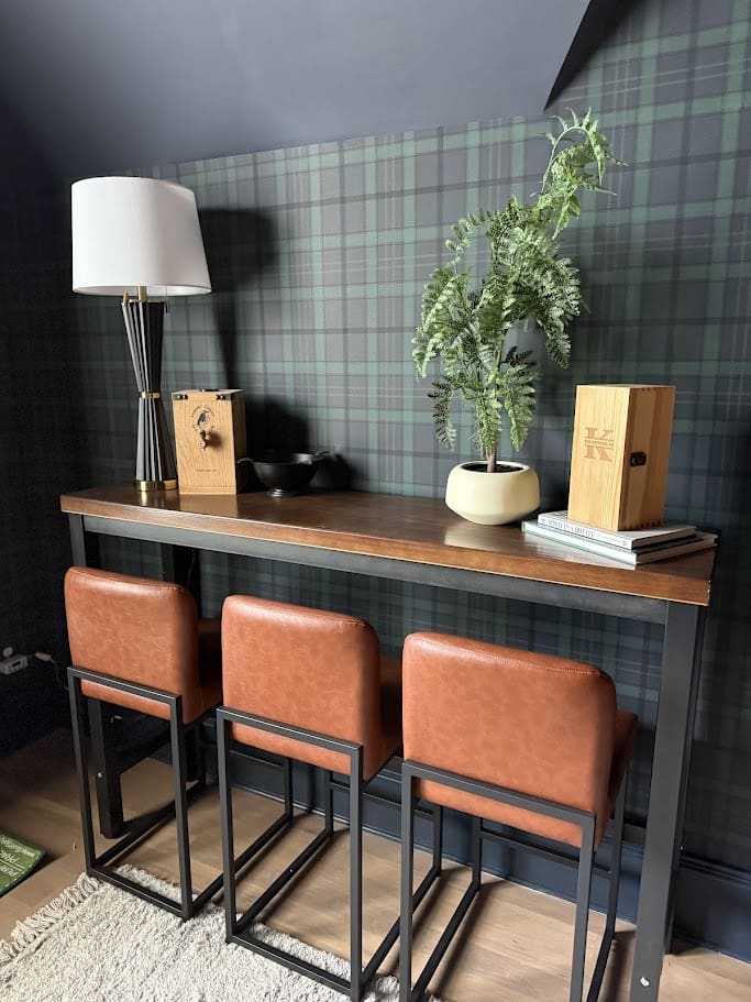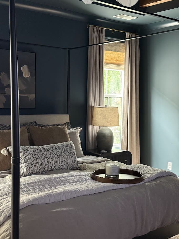 The entryway was also revitalized with new wallpaper, perfectly balancing the owners style. In the primary bedroom, a moody paint color, new furniture and bedding were introduced to create a serene and luxurious retreat. Updated window treatments and thoughtfully chosen lighting fixtures complete the transformation, along with stylish accessories that add personality and comfort to the space. In a future golf simulator room we added a bold yet traditional wallpaper to blend Pinehurst vibes into the home. Each area now boasts a refreshed look that combines modern style with everyday functionality, ensuring the home feels both beautiful and welcoming.