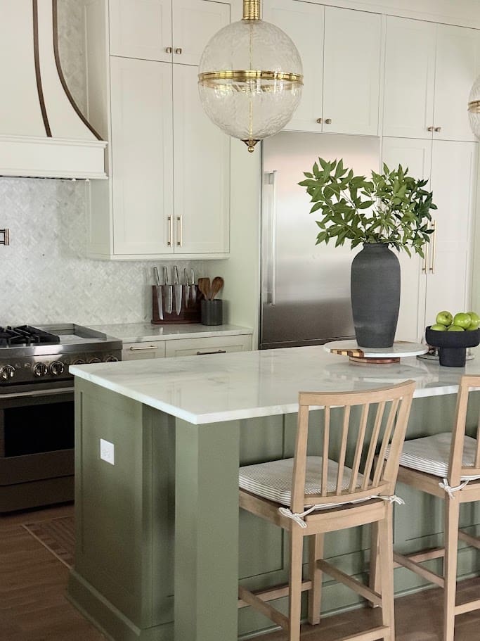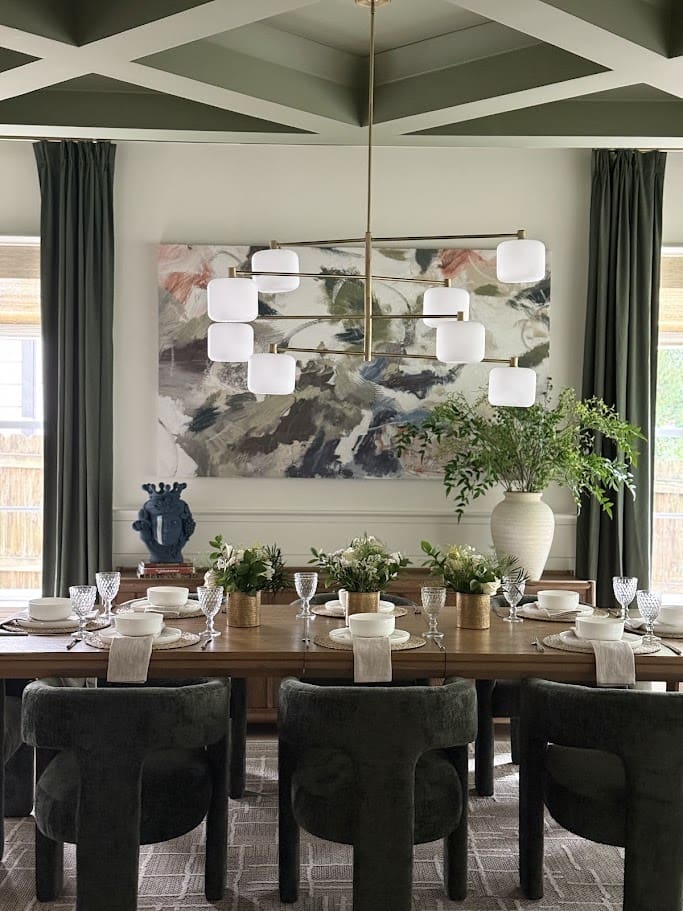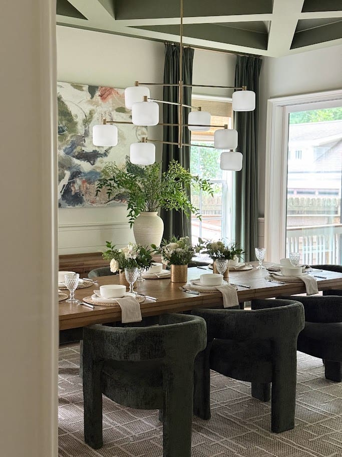 In this home we were able to refresh multiple areas, starting with the living room. This space was transformed with the addition of new furniture, including a contemporary sofa set and a stylish coffee table, which together create a cozy and inviting atmosphere. In the kitchen, we updated the area with a bold new paint color on the island and killer lighting. In the dining, we transformed this space with the same beautiful island color edit and gave it new life with bold and artsy furniture. New lighting serves as a focal point, casting a warm glow that enhances the room’s sophisticated yet comfortable ambiance.